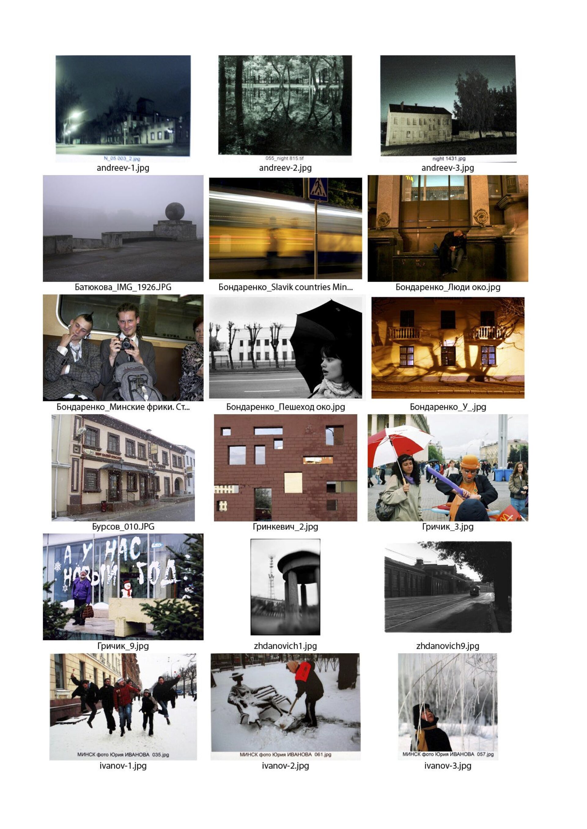 Визуальный материал выставки несколько отличается от фотографического наполнения альбома «Минские фотографии». Этому есть своё объяснение: законы создания и прочтения экспозиции внутри галерейного пространства сильно отличаются от восприятия изображений в печатных изданиях. В рамках одной выставки мы пытались «подружить» очень разные, порой противоречивые взгляды на парадный Минск и его повседневную жизнь, показать как знакомые уголки припомаженного города (правда, захваченные как бы врасплох с новых, неожиданных ракурсов), так и совсем незнакомые места, которые редко становятся объектами исследования минских фотографов.